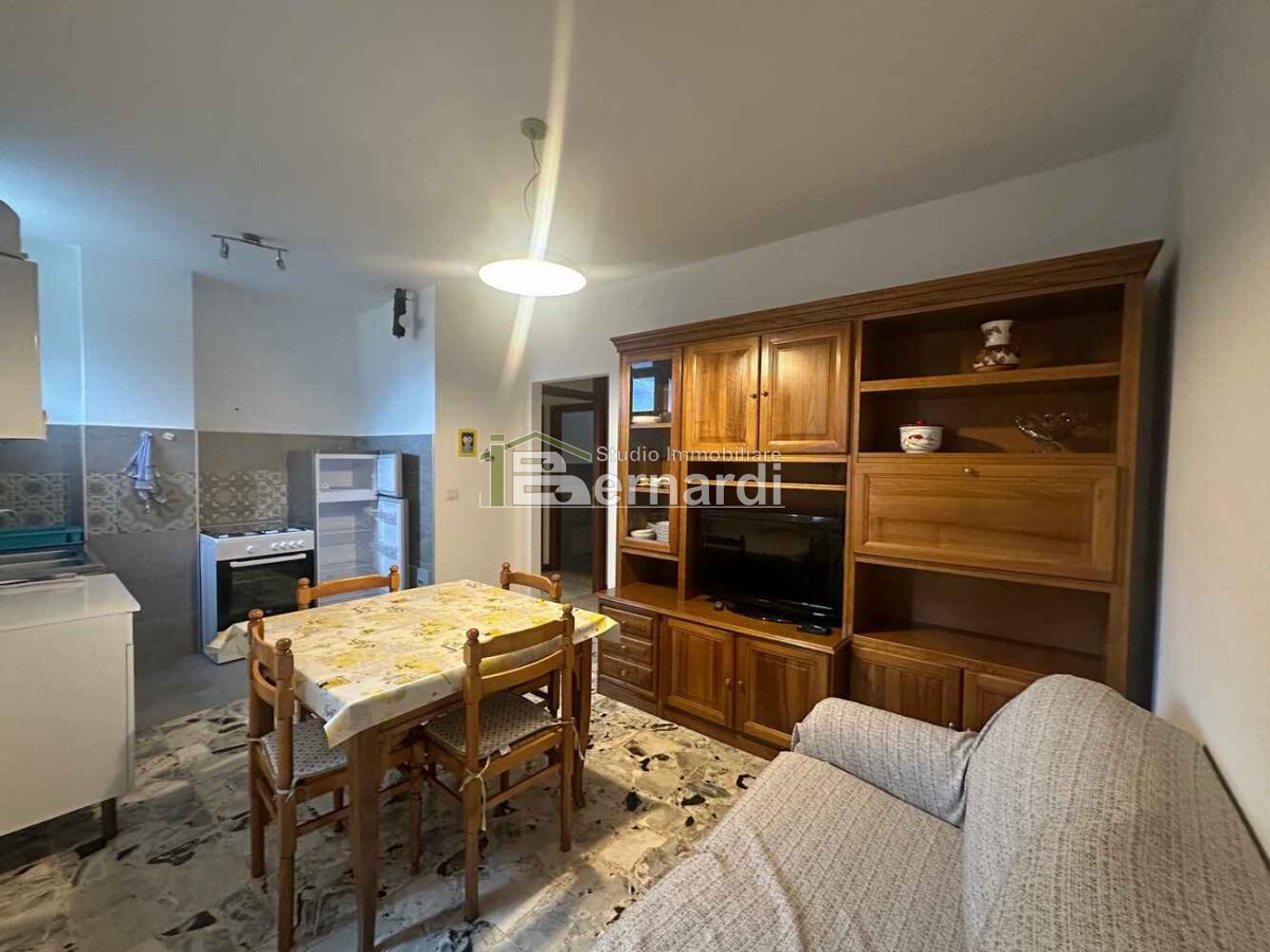 L'atrio conduce inoltre alla zona giorno, caratterizzata da cucina a vista, tavolo da pranzo, area living con divano e TV, in un ambiente funzionale e luminoso.