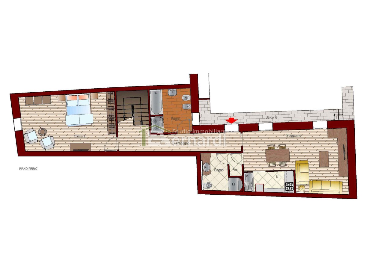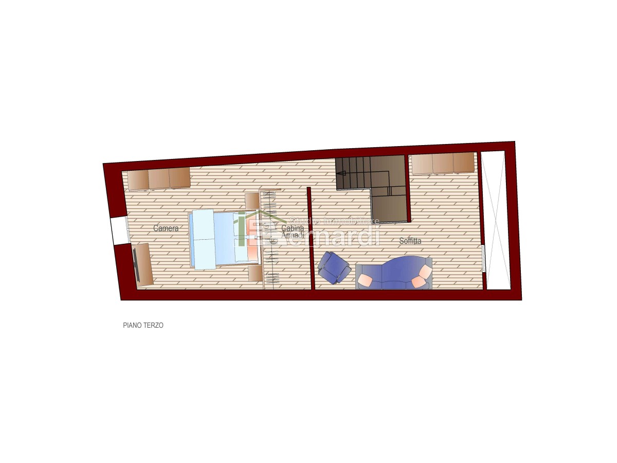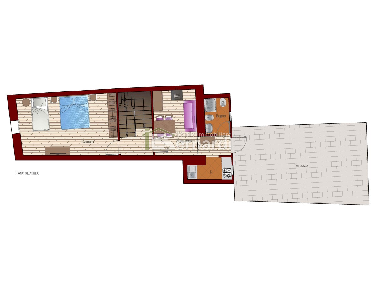 Con scala interna si accede al primo piano con la seconda ampia camera con affaccio suggestivo su piazza Corsini tramite portafinestra, oltre a soggiorno, cucinotto e bagno. Su questo livello troviamo anche l'ampio terrazzo, uno dei punti di forza dell'immobile.
