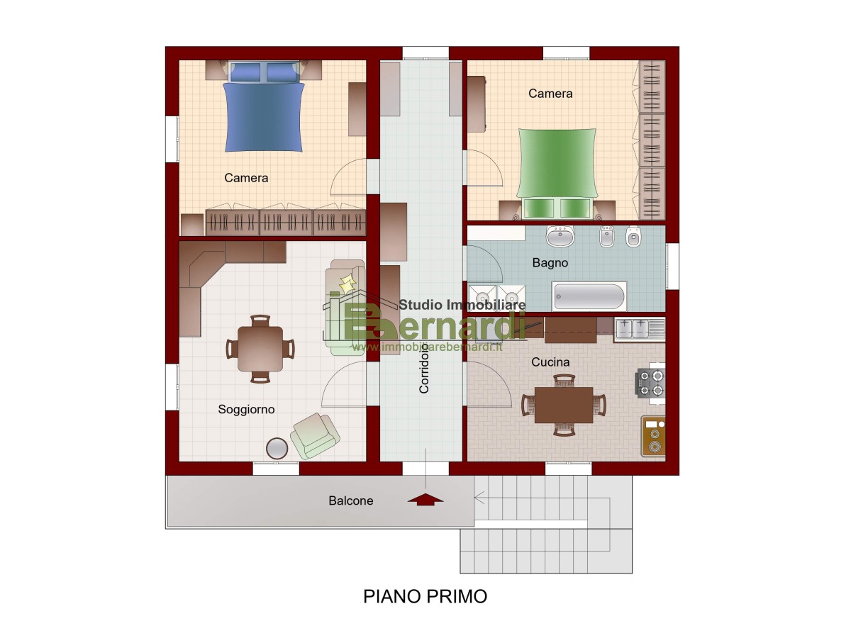 Situato lungo la strada principale di accesso al paese, questo appartamento occupa l’intero primo piano di una casa indipendente di tre unità.