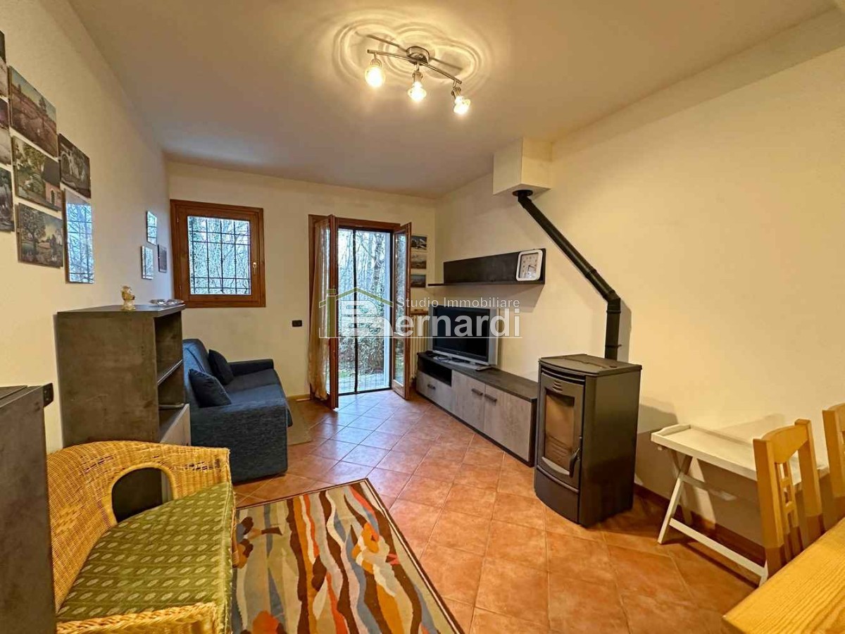L’ingresso conduce alla zona giorno open space, dove il legno naturale della cucina e degli arredi creano subito una tipica atmosfera di casa di montagna, luminoso e accogliente, dotato di stufa a pellet, portafinestra con accesso diretto al giardino privato di 29 mq. Un divano letto consente di ospitare comodamente altri 2 posti letto.