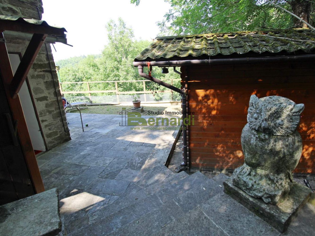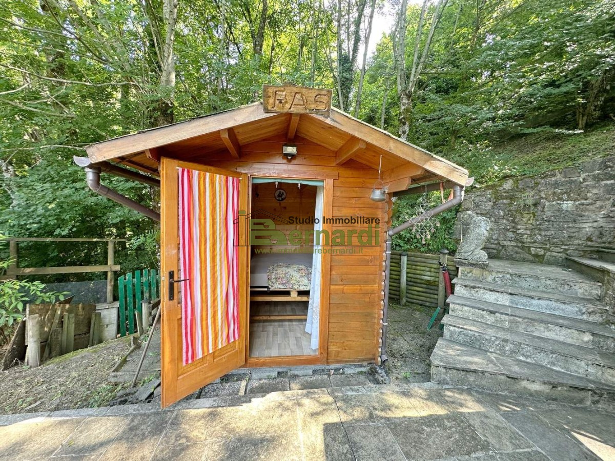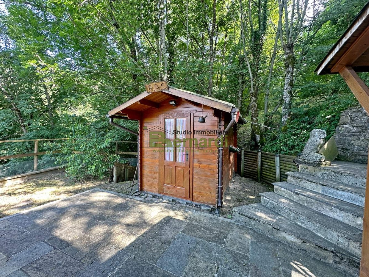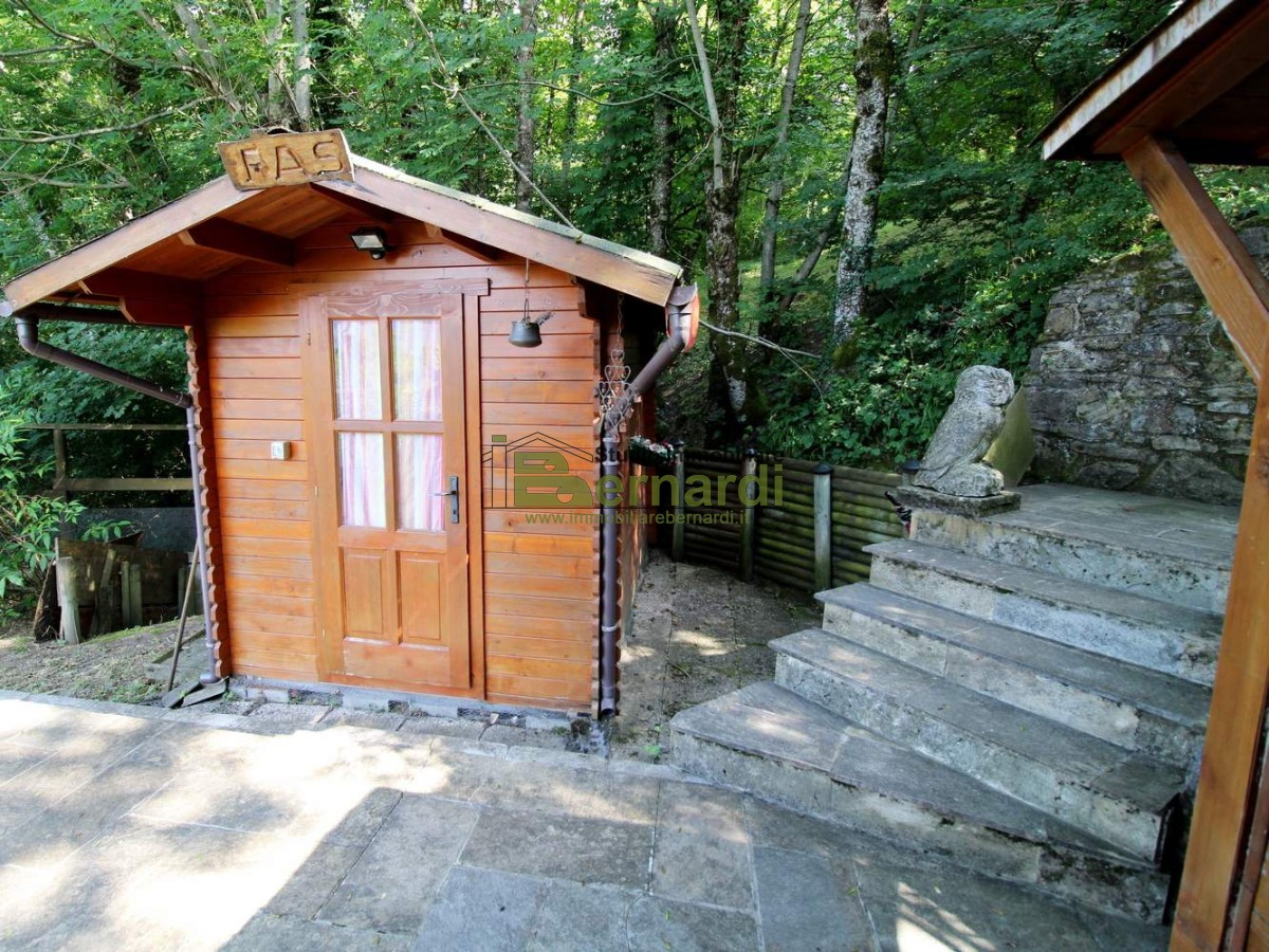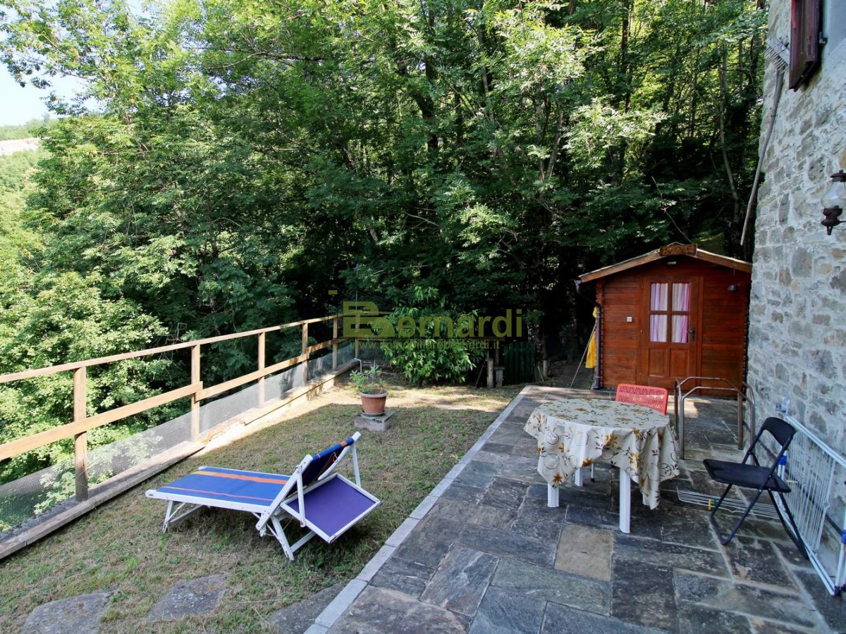 Piccola abitazione in sasso con giardino e terreno boschivo.