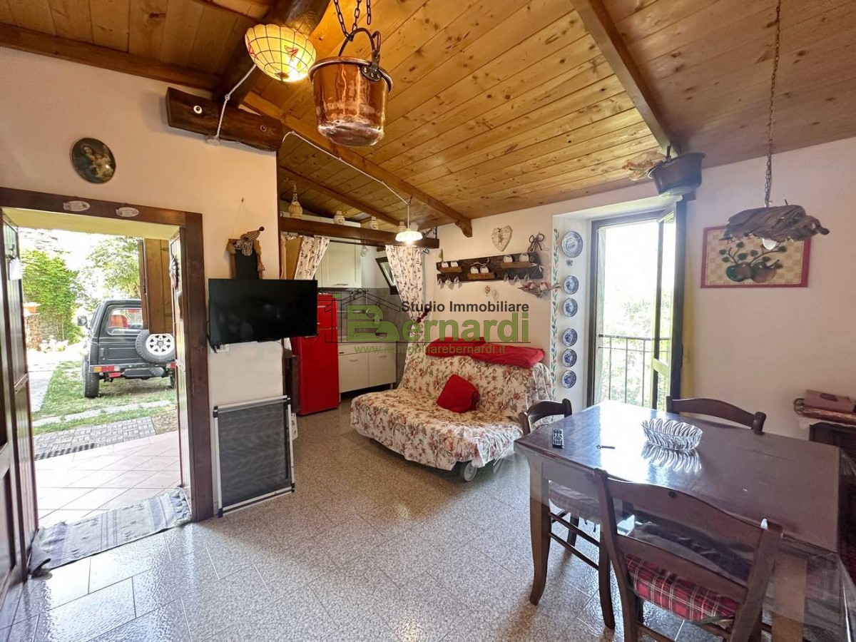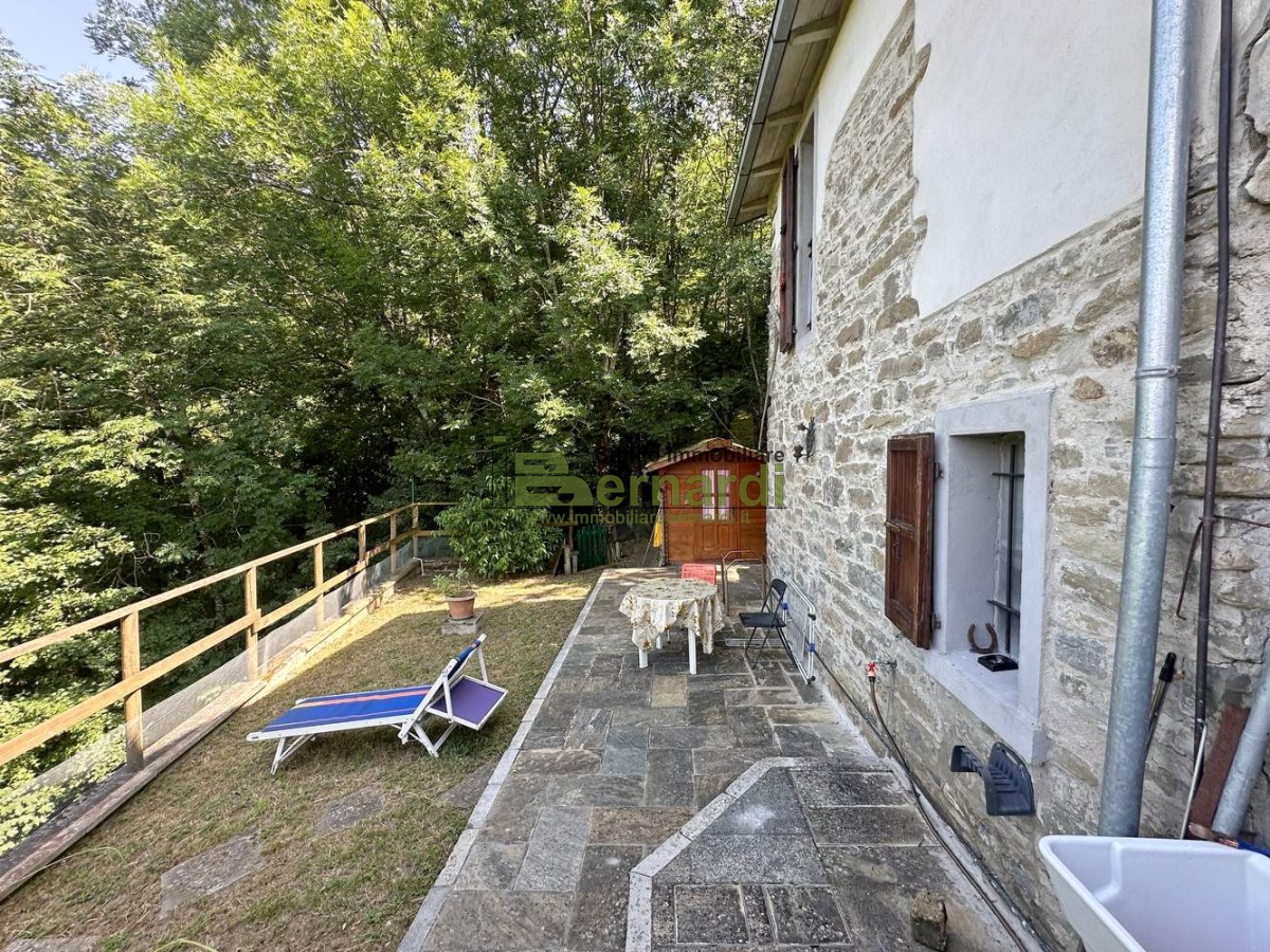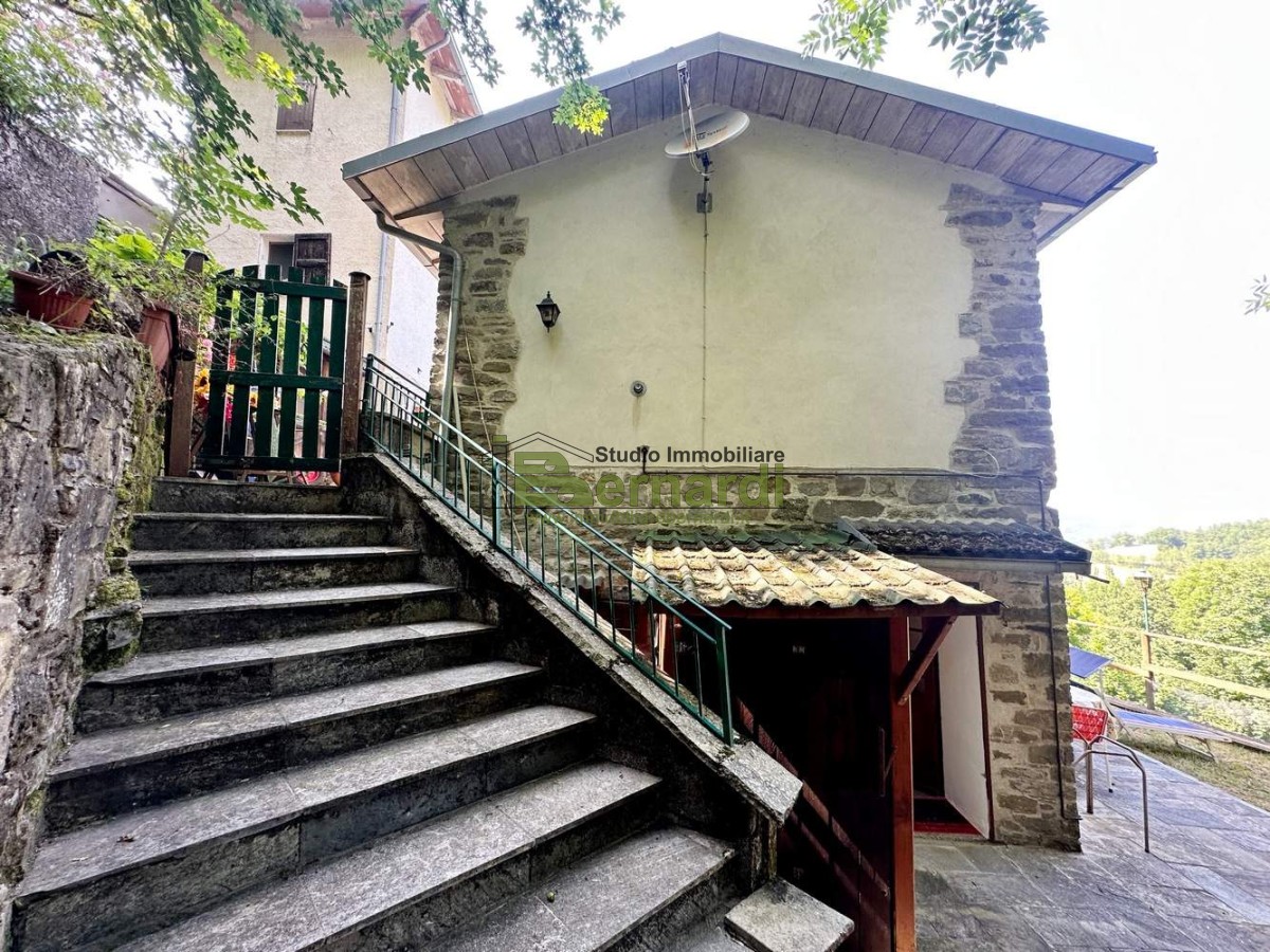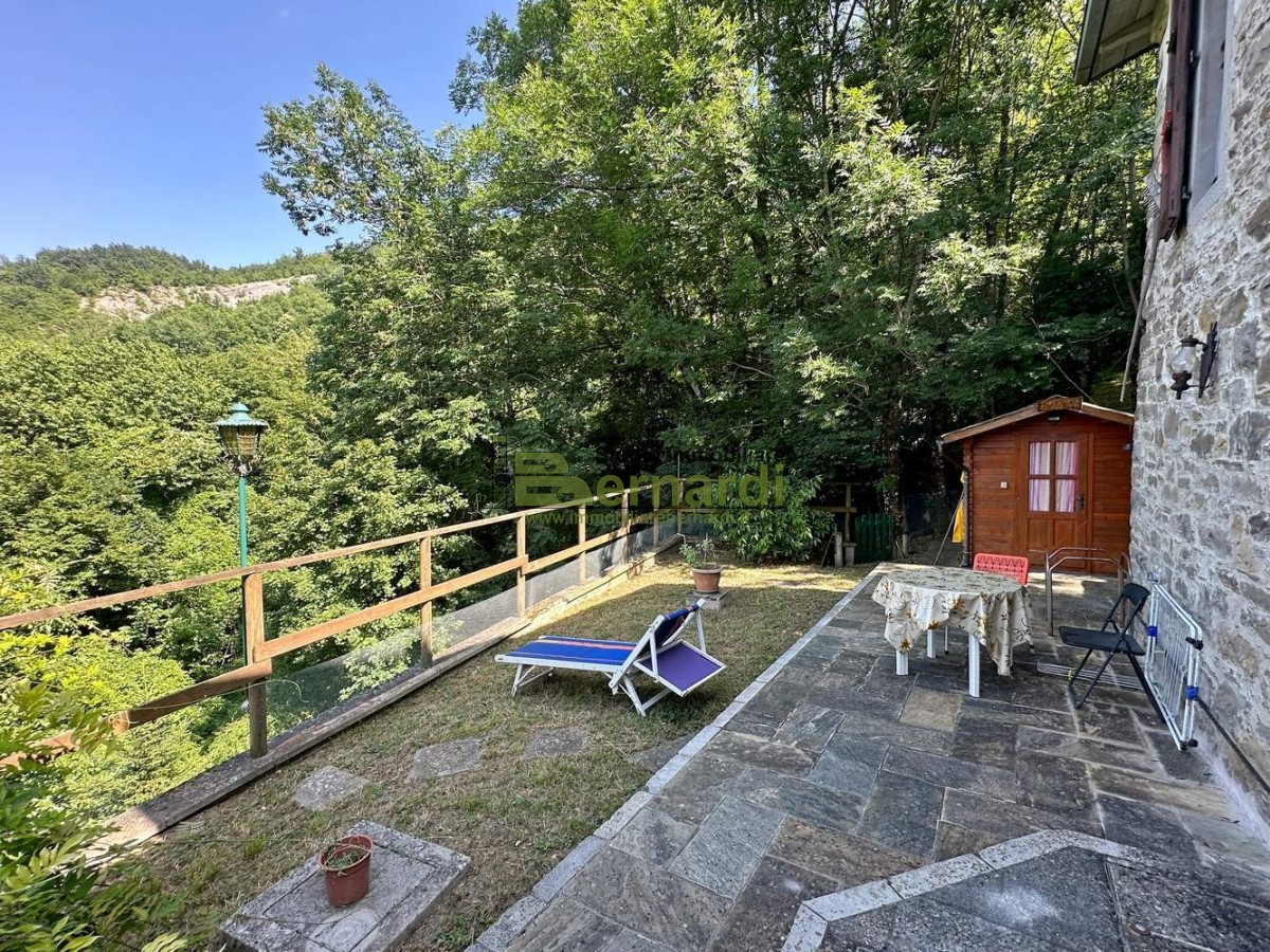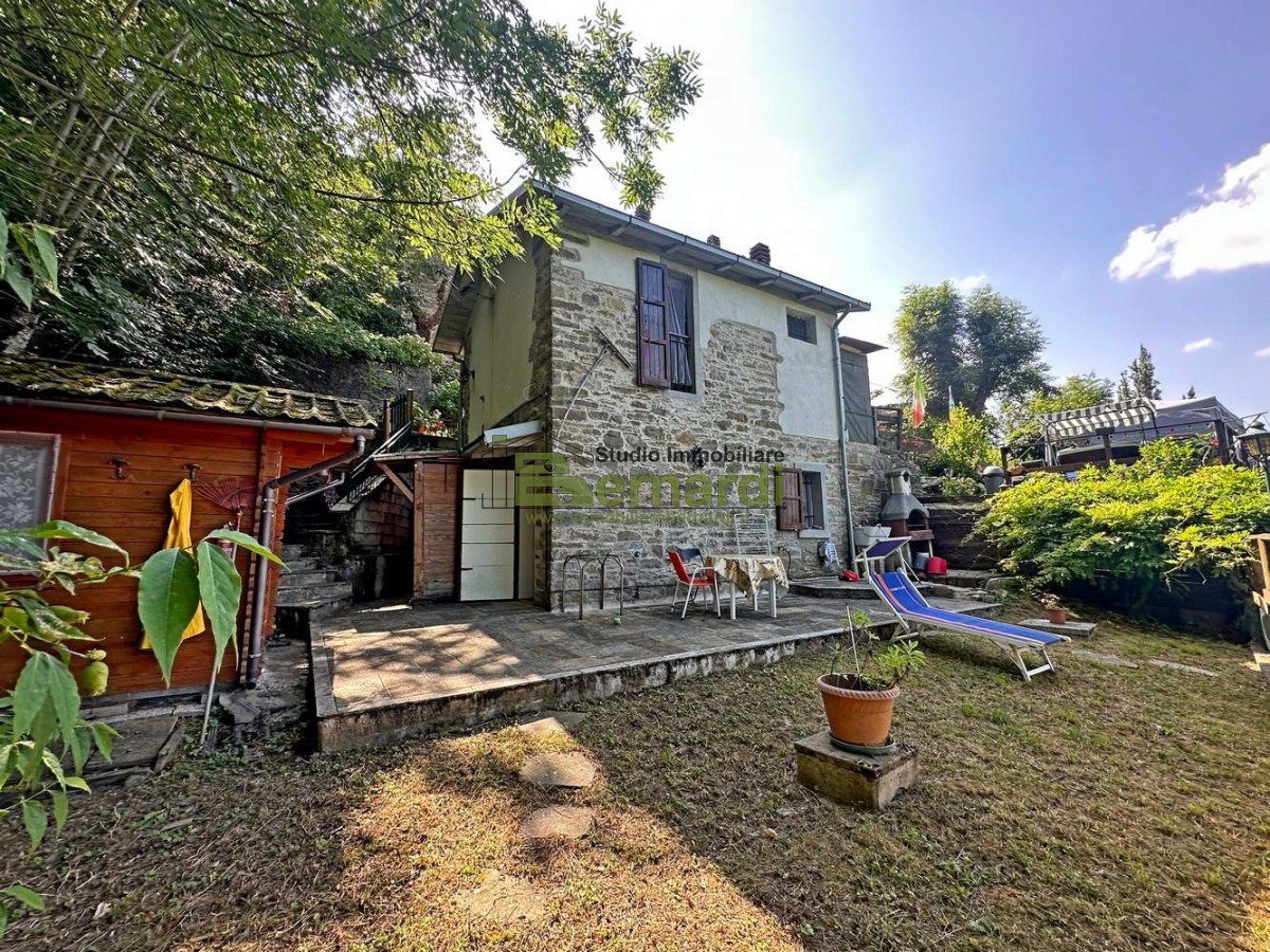 Piccola abitazione in sasso con giardino e terreno boschivo.