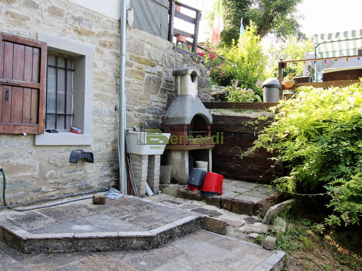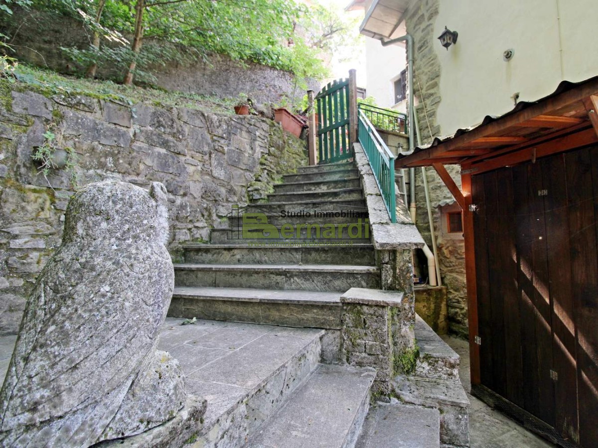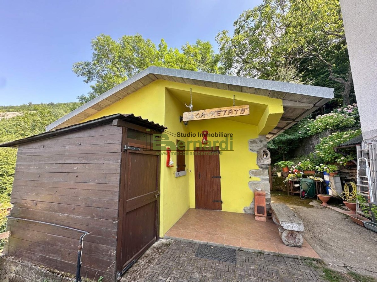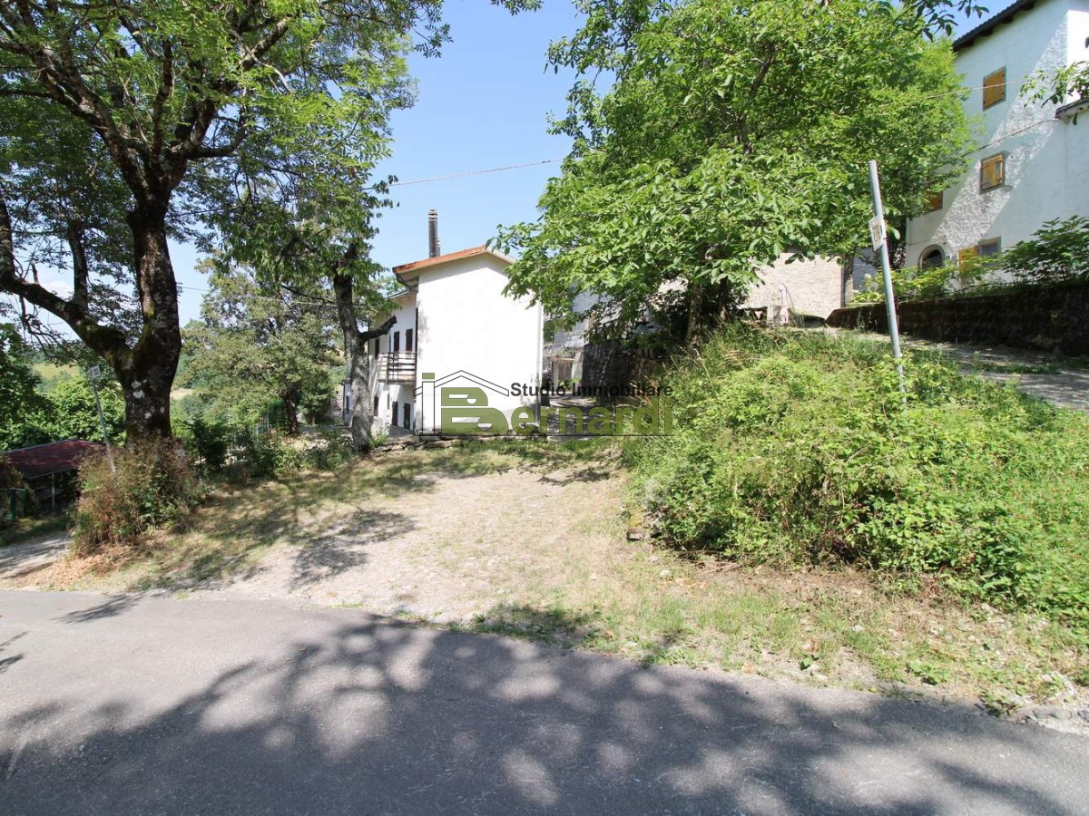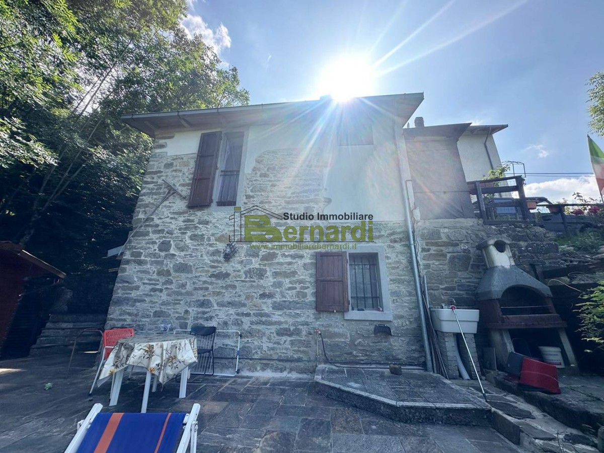 Piccola abitazione in sasso con giardino e terreno boschivo.