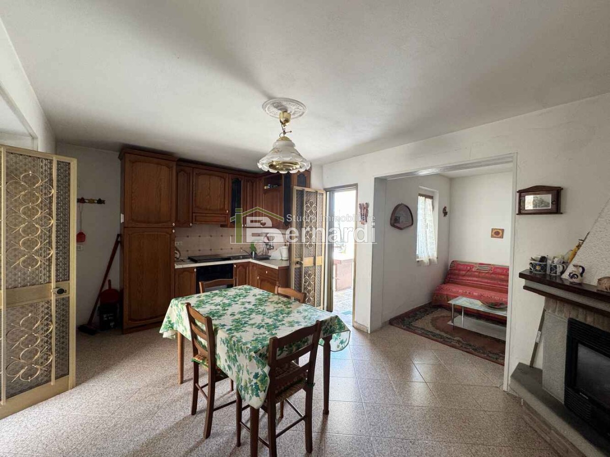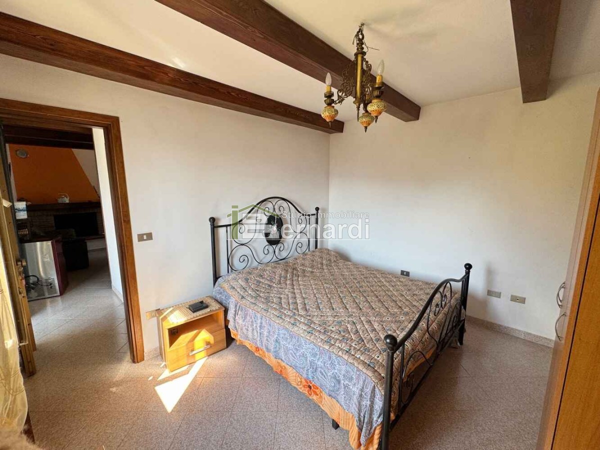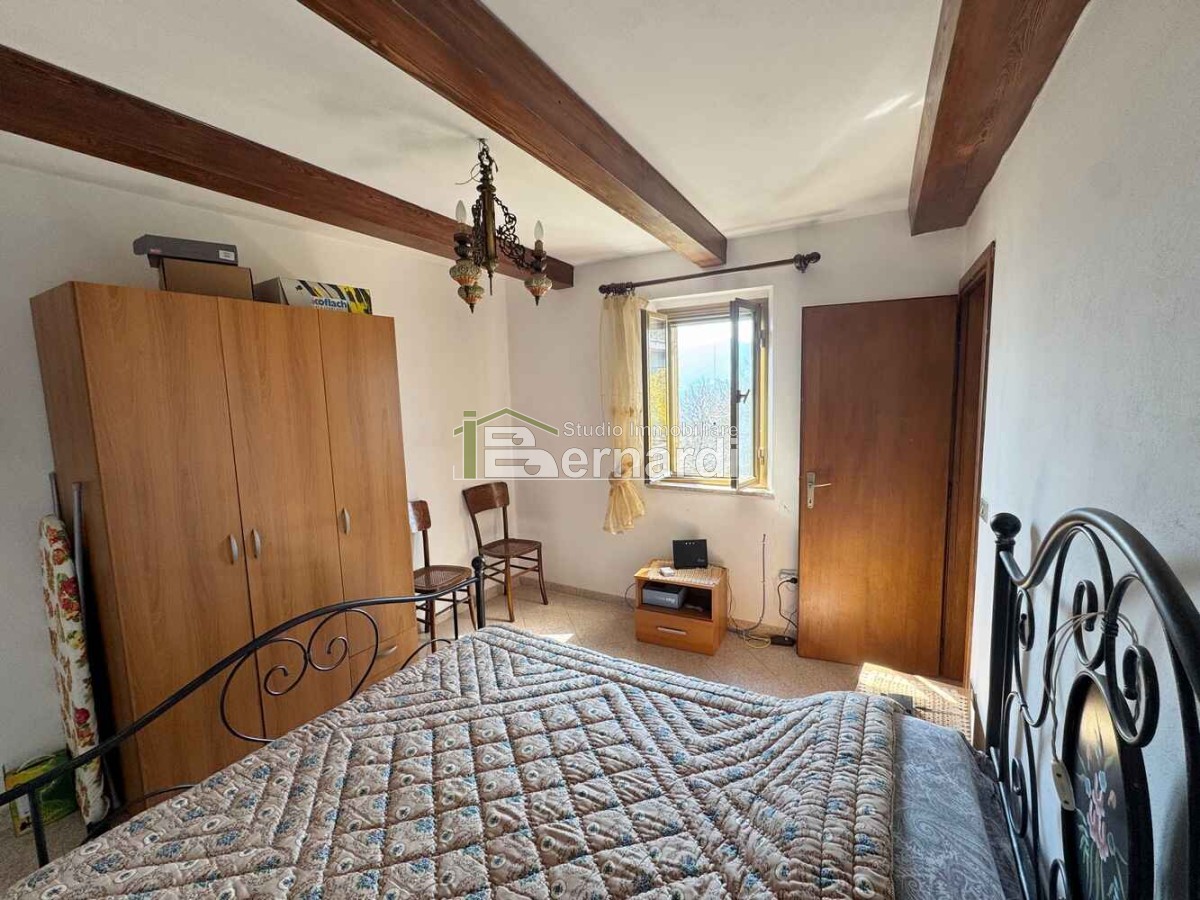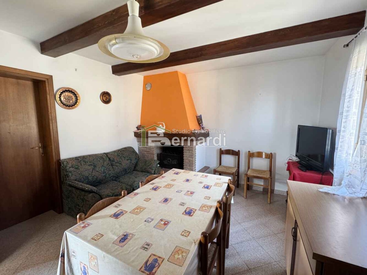 L’appartamento al primo piano è accessibile tramite scala esterna che conduce a un ampio terrazzo panoramico coperto, vero punto di forza della casa. All'interno, la zona giorno open space con angolo cottura e area living è impreziosita da un caratteristico camino in pietra, che conferisce all'ambiente un accogliente sapore rustico. La zona notte comprende due camere da letto e un bagno finestrato con doccia.