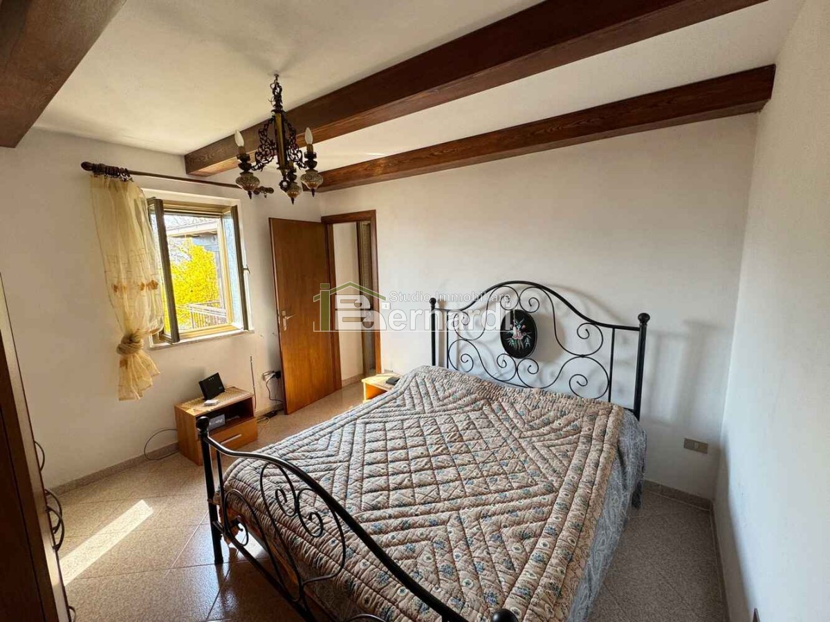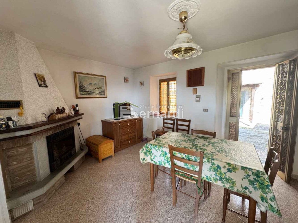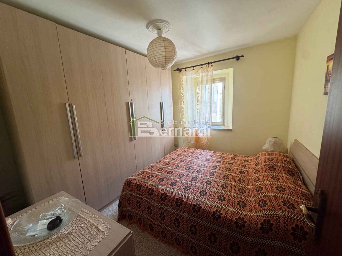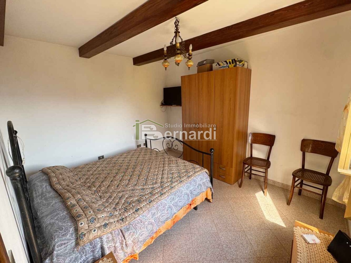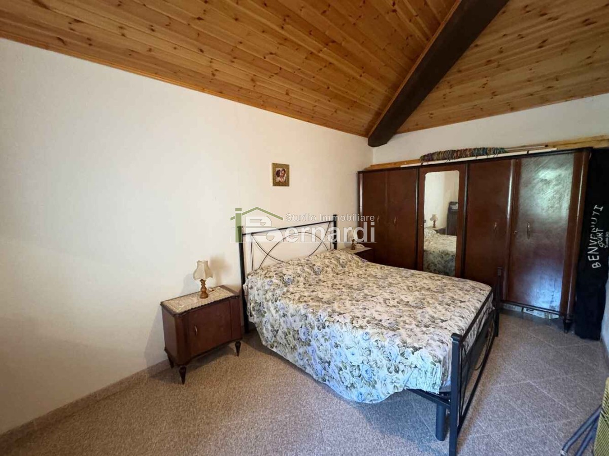 L’appartamento al primo piano è accessibile tramite scala esterna che conduce a un ampio terrazzo panoramico coperto, vero punto di forza della casa. All'interno, la zona giorno open space con angolo cottura e area living è impreziosita da un caratteristico camino in pietra, che conferisce all'ambiente un accogliente sapore rustico. La zona notte comprende due camere da letto e un bagno finestrato con doccia.