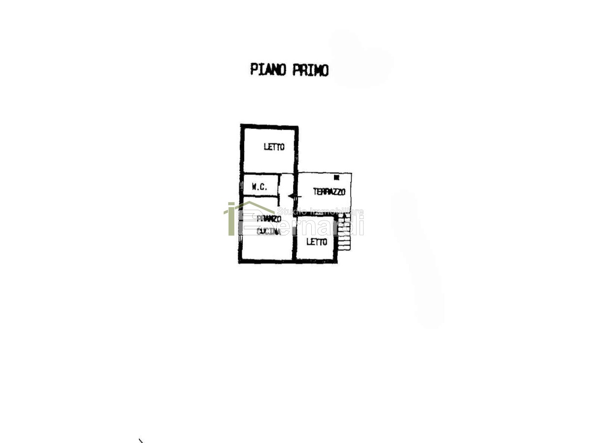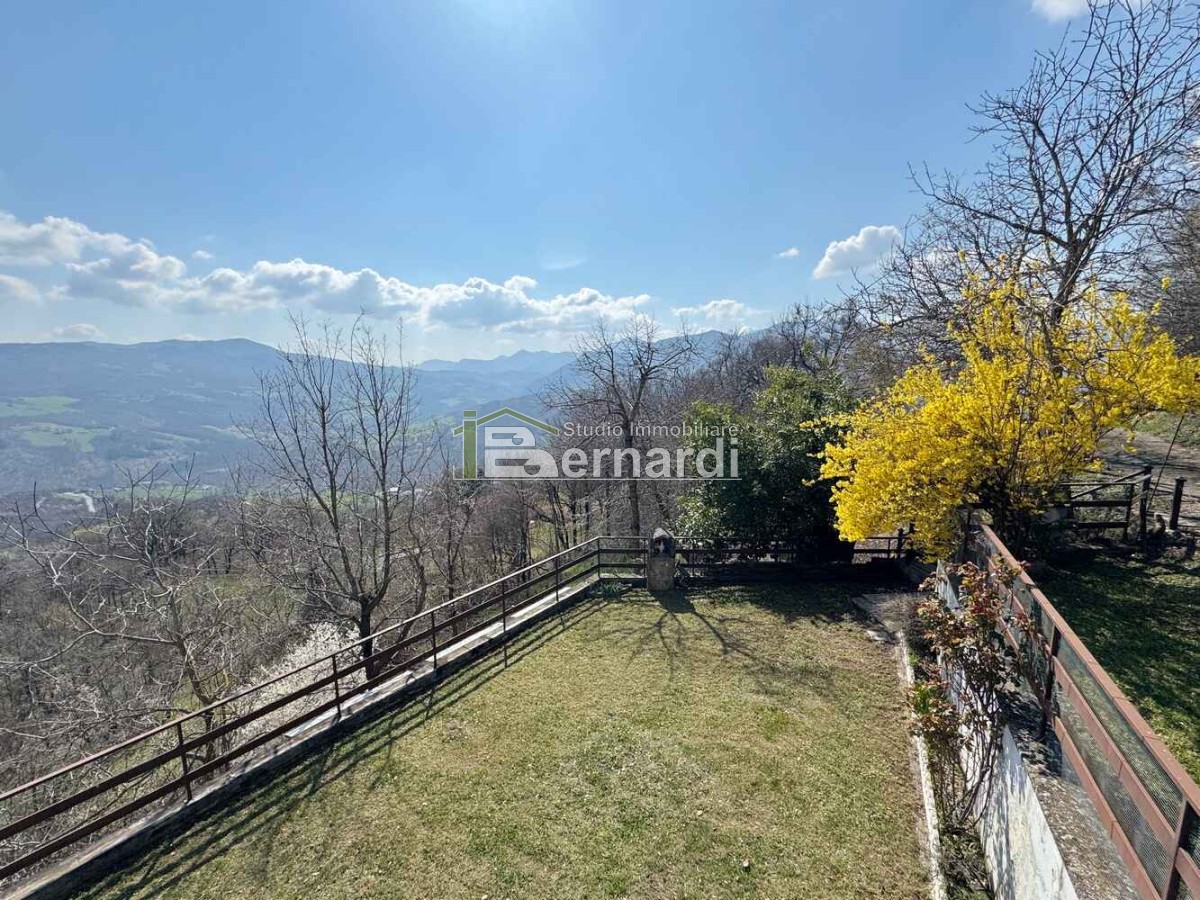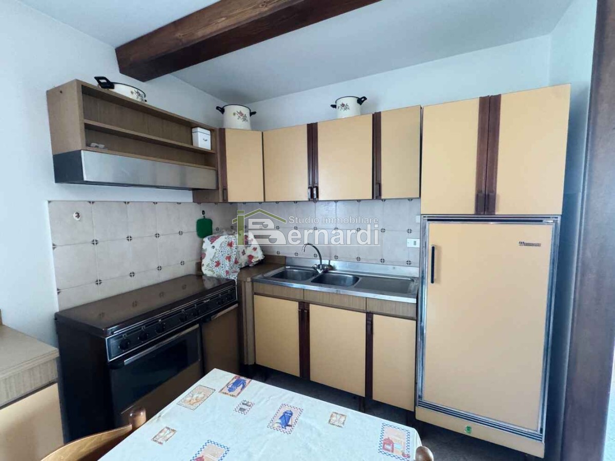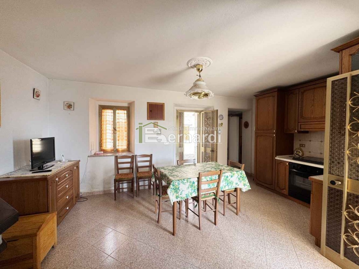 L’appartamento al primo piano è accessibile tramite scala esterna che conduce a un ampio terrazzo panoramico coperto, vero punto di forza della casa. All'interno, la zona giorno open space con angolo cottura e area living è impreziosita da un caratteristico camino in pietra, che conferisce all'ambiente un accogliente sapore rustico. La zona notte comprende due camere da letto e un bagno finestrato con doccia.