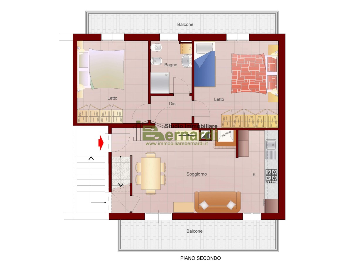 L’abitazione offre spazi luminosi e ben distribuiti : un ampio soggiorno con camino, una cucina a vista completa e funzionale, disimpegno, due camere da letto matrimoniali e un bagno finestrato con doccia.