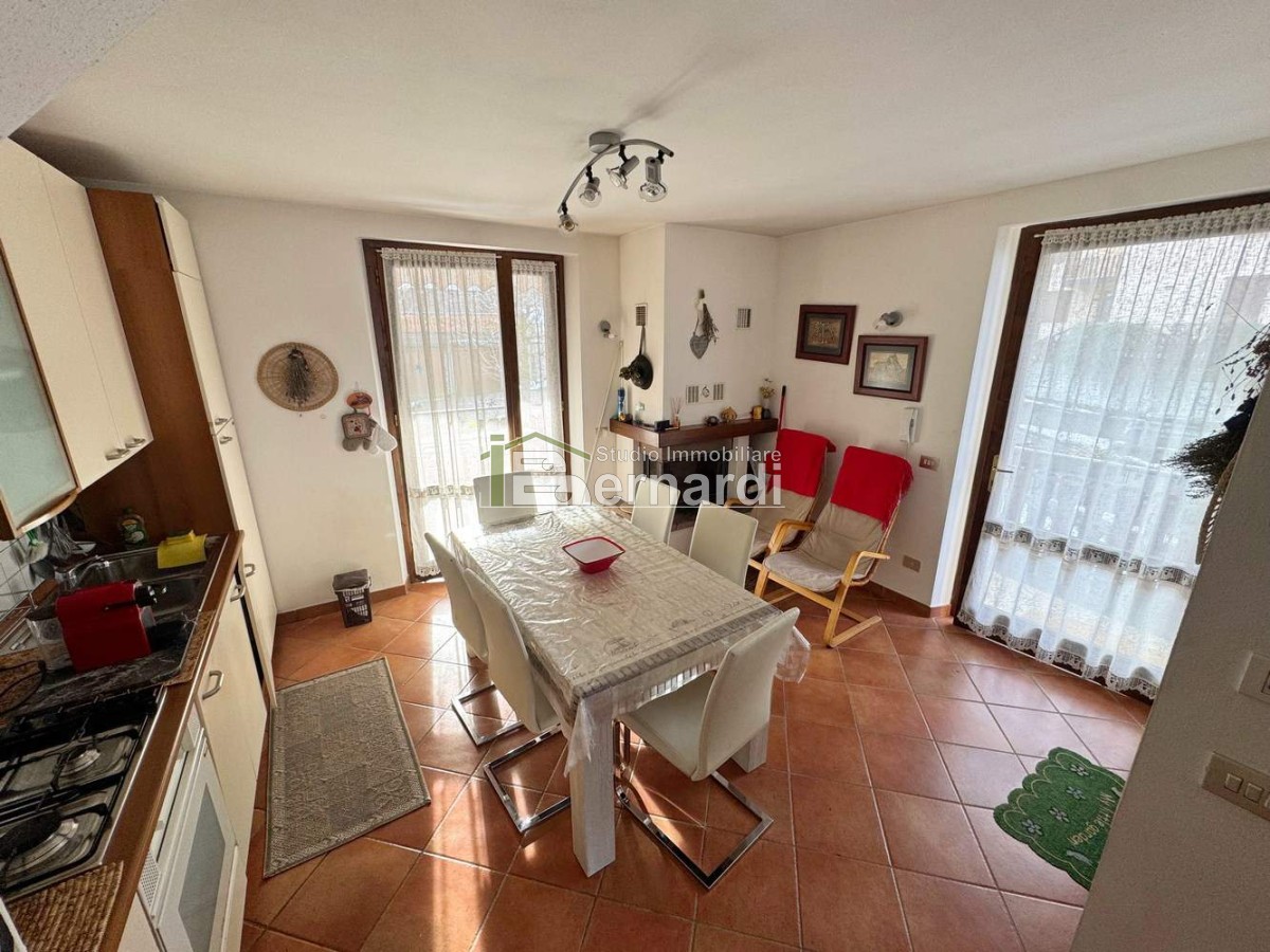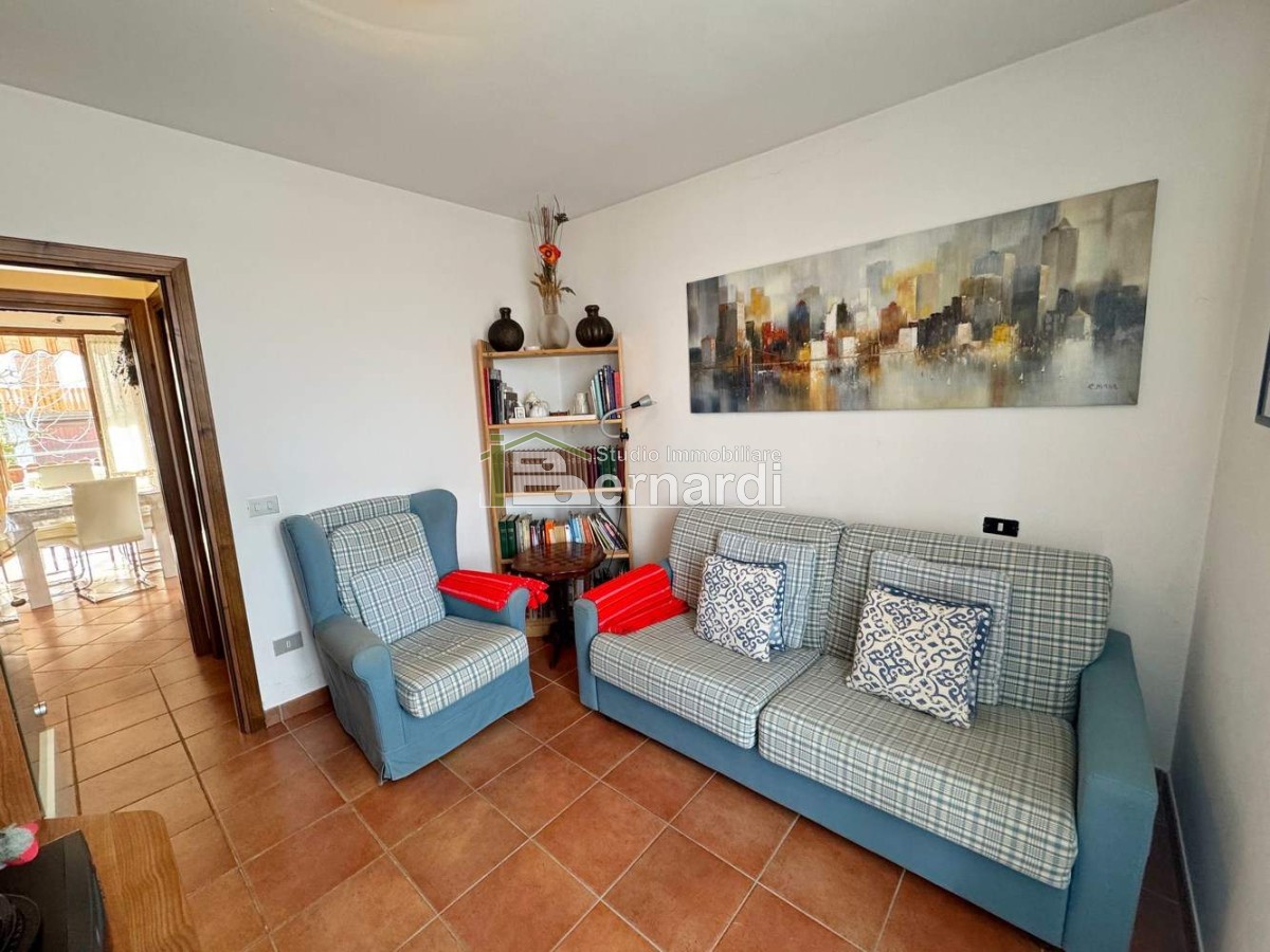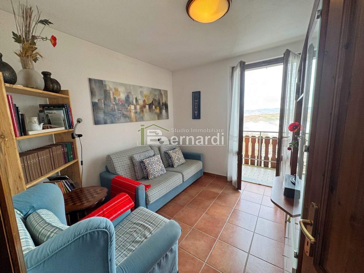 Tramite scala esterna si raggiunge l'ingresso: entrando ci accoglie un luminoso living con camino e cucina a vista, attrezzato come zona pranzo. Adiacente si trova un balcone coperto di circa 10 mq con vista sulla Rocca, ideale per godersi momenti all'aria aperta, dal disimpegno si accede a una camera matrimoniale, a un bagno finestrato con doccia e a una seconda camera, attualmente adibita a saletta relax, con terrazzino panoramico sulla vallata.